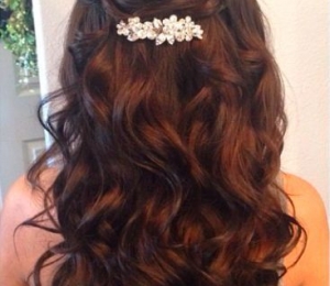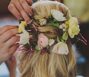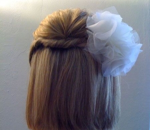 Coafura poate fi accesorizată atât cu flori naturale, cât şi cu agrafe de păr tip bijuterie