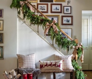 Dacă ai o scară interioară, poţi decora calea spre dormitoarele de la etaj cu o ghirlandă evergreen, din crengi de brad, fructe şi fundiţe.