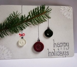 Felicitările cu nasturi sunt şi ele în tendinţe anul acesta. Din câţiva năsturei albi poţi să creezi omul de zăpadă sau cu 5 - 7 năsturei coloraţi poţi atârna câteva globuleţe colorate de felicitarea ta.