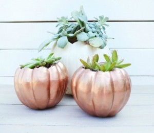 Oferă-le plantelor tale de interior un aspect tomnatic chic cu ajutorul unor ghivece din dovleci vopsiţi arămiu.