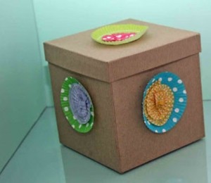 Trucul DIY: Inveleste cutia in hartie. Apasa pe centrul rotund de la doua forme/hartii pentru briose de marimi diferite, niveland mijlocul, dar lasand incretiturile intacte. Folosind o banda dublu adeziva, lipeste cele doua straturi forma de hartie mai mica peste forma mai mare de briose, iar apoi infasoara-le in jurul unei laturi a cutiei. La final, poti lega cutia cu o ata, o sfoara sau o panglica colorata si sa faci un nod simplu.