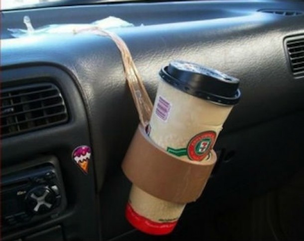 Nu ai un suport pentru paharul cu suc ori pentru cafeaua de dimineata in masina? O rola mare de banda adeziva prinsa de bord reprezinta cel mai ingenios suport.
