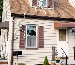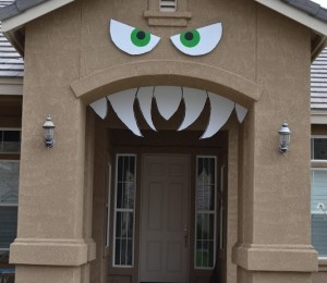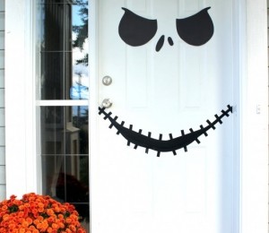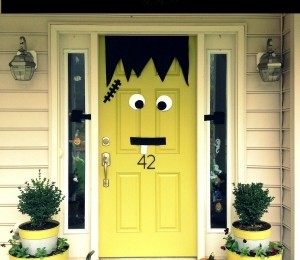 Personalizează-ţi uşa de la intrare. Spre exemplu, poţi să o transformi în monstrul Frankenstein cu doar câteva bucăţi de material negru şi alb,o foarfecă şi un lipici bun.