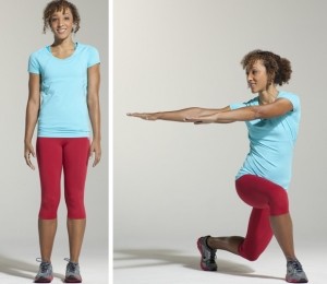 Cu piciorul drept, păşeşte şi îndreaptă-ţi corpul spre stânga (imaginează-ţi poziţia orei 11, daca tu ai sta pe un ceas imens). Îndoaie-ţi genunchii până când coapsa ta dreaptă este paralelă cu podeaua, pe măsură ce îţi răsuceşti trunchiul spre dreapta. Stai dreaptă. Fă un set, apoi schimbă exerciţiul şi fă-l cu celălalt picior şi repetă. Vezi imaginea 2 din galeria foto.