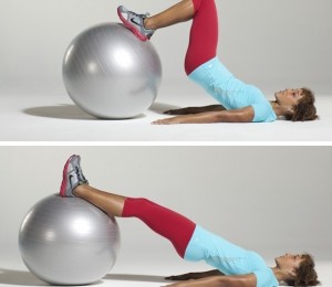 Încordează-ţi muşchii fesieri, ridică-ţi şoldurile de pe podea, îndoaie-ţi genunchii şi rostogoleşte mingea de fitness spre posteriorul tău, cu ajutorul călcâielor. Întinde-ţi picioarele, rostogolind mingea de fitness către exterior, către înainte. Repetă exerciţiul fără să îţi laşi şoldurile mai jos. Vezi imaginea 3 din galeria foto.