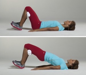 Cu vârfurile picioarelor ridicate şi cu un prosop rulat şi strecurat între coapse şi gambe, încordează-ţi şi strânge muşchii fesieri şi ridică-ţi şoldurile, astfel încât corpul tău să formeze o linie dreaptă de la umeri până la genunchi. Încet-încet, lasă-ţi trunchiul în jos şi repetă. Vezi imaginea 5 din galeria foto. (Sursa)