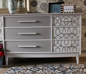 Pe o comodă mai veche - dacă te-ai plictisit de comoda eche din dormitor, o poţi transforma complet aplicând tapet pe ea.