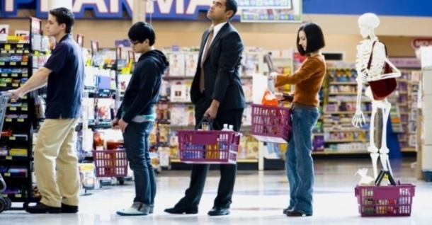Deşi pare contraproductiv, cercetătorii arată că este cât se poate de adevărat că astfel reduci timpul petrecut la coadă în supermarket. Fiecare persoană aflată la coadă are nevoie de timp pentru a saluta, a aranja produsele cumpărate înapoi în cărucior sau în plase, a achita şi a elibera locul pentru următorul cumpărător. De regulă, scanarea fiecărui produs durează câte 3 secunde, iar restul amabilităţilor necesită în jur de 41 de secunde. Astfel, dacă te aşezi în spatele unei persoane care are 100 de produse în cărucior, vei petrece în jur de 6 minute stând la coadă. Dacă te aşezi la coadă şi ai în faţă 4 persoane cu câte 20 de produse în coş, va dura în jur de 7 minute. Asta înseamnă că o coadă formată din câţiva oameni cu căruciorul plin se mişcă mai repede.