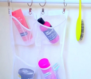 Folosește un organizator de pantofi - agață de bara de la perdeaua de duș un organizator pentru pantofi în care vei depozita apoi produsele cosmetice folosite în timpul dușului.