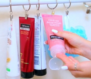 Agață produsele cosmetice de bara perdelei de duș - poți folosi cleștișori pentru a agăța șamponul și gelul de duș de bara perdelei. Astfel, le vei avea mereu la îndemână și nu va mai trebui să te apleci după ele.