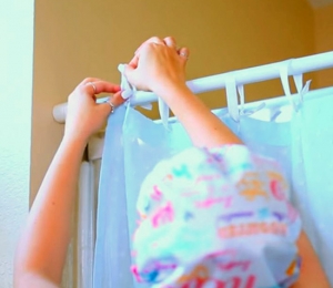 Renunță la inelele pentru perdeaua de duș - înlocuiește inelele pentru perdeaua de duș cu mai multe panglici pe care le vei prinde apoi cu o fundă voluminoasă. Asteptul băii tale va fi complet schimbat.