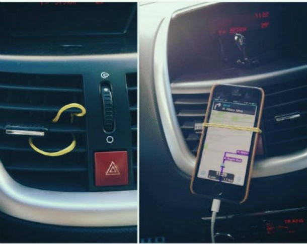 Prinde-ti telefonul de grila de la aerul conditionat din bord cu ajutorul unui elastic! Astfel, iti va fi mult mai usor sa folosesti sistemul de navigatie GPS si nu vei fi nevoita sa iti cumperi un suport costisitor de telefon.