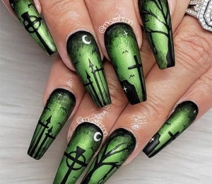Dacă eşti mai îndrăzneaţă şi îţi plac filmele horror, cu siguranţă vei aprecia modelele de manechiură de Halloween cu scene din cimitir.