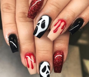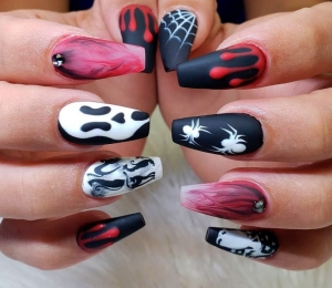 Te poţi orienta către o manichiură de Halloween simplă, cu negru şi roşu, sau poţi opta pentru un model de unghii albe cu amprentă de sânge. Desigur, vei găsi în galeria foto de mai jos şi modele de unghii cu fantome, unghii de Halloween cu pisici negre sau modele simple de unghii cu fantome sau mumii. Alege modelul care îţi place şi treci la speriat prietenii cu noua ta manichiură!
