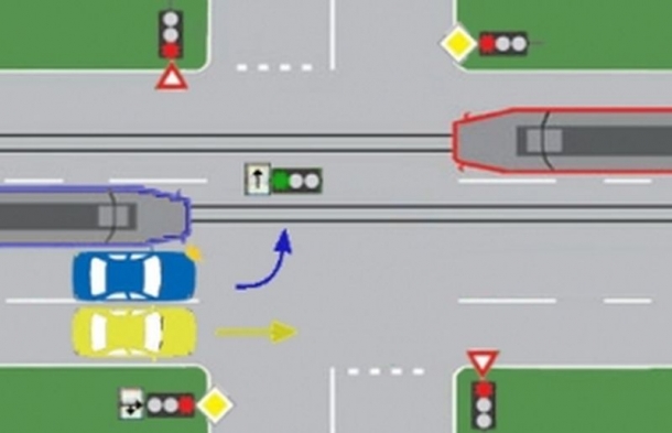 Priveşte cu atenţie imaginea de mai jos. După o analiză atentă a acesteia, poţi spune care dintre vehicule îşi pot continuarea deplasarea în intersecţie?
