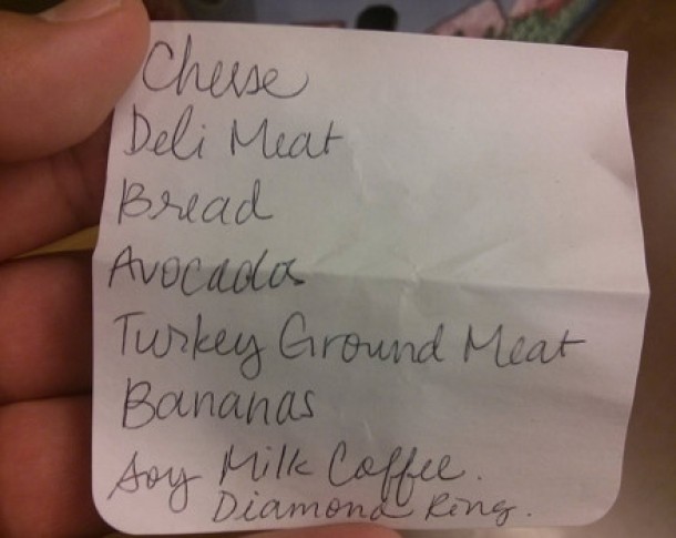 Lista contine branza, carne, paine, avocado, banane, lapte de soia, cafea, iar la final, tanara a scris ca isi doreste un inel cu diamant. Sursa.