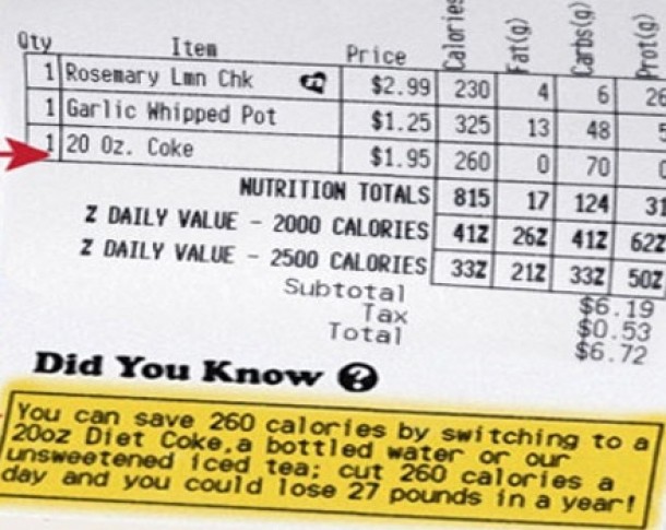 Mesajele de pe notele de plata suna cam asa: „Daca renunti la maioneza vei consuma cu 150 de calorii mai putin, dar vei scapa si de 10 g de grasimi.”