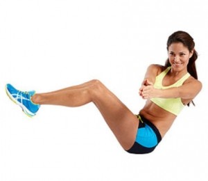 Stai pe sol in pozitie sezut, cu genunchii indoiti si talpile pe sol. Lasa-te usor pe spate, incordand totodata muschii abdominali. Strange bratele la piept si intoarce trunchiu spre dreapta, dupa care spre stanga.