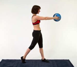 Vei avea nevoie de o minge medicinala pentru acest exercitiu. Stai in pozitie dreapta, cu picioarele usor departate. Tine mingea in fata, cu ambele maini. Adu mingea la nivelul pieptului, impinge in fata si mentinand spatele drept roteste trunchiul odata cu mingea in partea stanga. In timpul acestei miscari roteste si piciorul stang, pentru a indeparta mingea de corp cat mai mult cu putinta. Stai in aceasta pozitie pentru o secunda, dupa acre revino in pozitia initiala. Repeta aceeasi miscare si pentru partea opusa. Fa cate 15-20 de repetitii pentru fiecare parte.