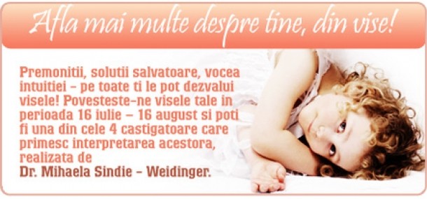Participa la concurs cititoarele care povestesc visele lor pe forum, accesand http://www.feminis.ro/forum/divertisment/cafeneaua-fetelor-feminis/afla-mai-multe-despre-tine-din-vise-36793/