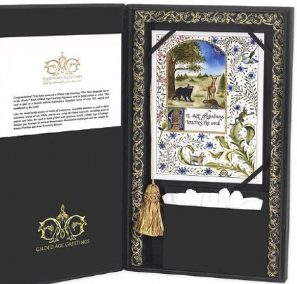 Nu este vorba despre o felicitare oarecare. O companie din Florida, specializata in felicitari de lux, foloseste hartie rezistenta, aur de 23 de carate si pietre pretioase pentru a crea o felicitare ce valoreaza nici mai mult, nici mai putin de 5.000 de dolari.
