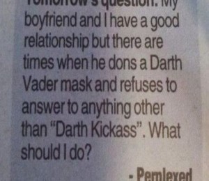 "Intrebarea de maine: Iubitul meu si cu mine avem o relatie buna, dar sunt momente cand el isi pune o masca precum a lui Darth Vader si refuza sa raspunda la alta formula in afara de 'Darth Kickass'. Ce ar trebui sa fac? Semnat, Nedumerita."