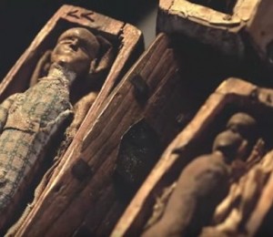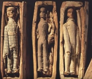 În timp ce băieţii căutau vizuini de iepuri, tinerii au dat peste ceva ce nu se aşteptau să descopere vreodată. Ascunsă departe de privirile curioşilor era o mică peşteră, în care băieţii au descoperit 17 sicrie în miniatură. Iar fiecare sicriu din această peşteră conţinea o mică figurină din lemn.