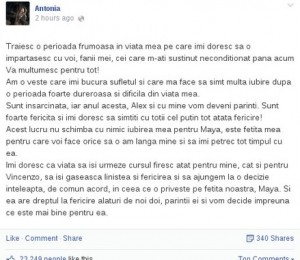 Imi doresc ca viata sa isi urmeze cursul firesc atat pentru mine, cat si pentru Vincenzo, sa isi gaseasca linistea si fericirea si sa ajungem la o decizie inteleapta, de comun acord, in ceea ce o priveste pe fetita noastra, Maya. Si ea are dreptul la fericire alaturi de noi doi, parintii ei si vom decide impreuna ce este mai bine pentru ea", a scris Antonia pe pagina ei oficiala de Facebook.