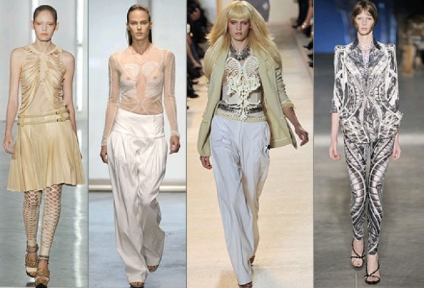 Rodarte Kate si Laura Mulleavy si-au bazat designul franjurat si excentric pe modelul scheletului uman, in timp ce Alexander McQueen a folosit printul ce imita o radiografie. Ohne Titel si Flora Gill au fost influentati de sculpturile ce infatiseaza corpul intr-un mod abstract ale lui Naum Gabo, lucru vizibil si in colectiile lor.