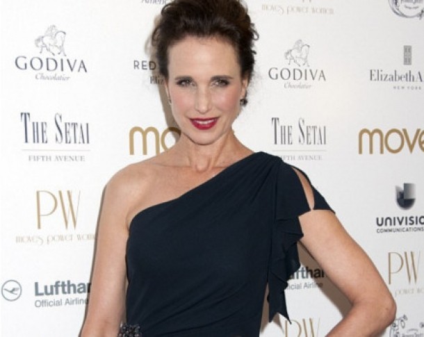 In varsta de 54 de ani, Andie a purtat o rochie navy lunga, pe un umar care ii punea perfect in valoare conditia fizica impecabila.
