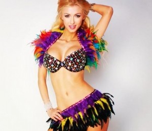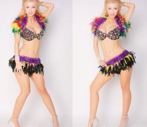 Recent, Andreea Balan si-a surprins fanii pe Facebook cu o fotografie in care apare imbracata intr-un sutien cu aplicatii colorate, combinat cu o fusta din pene in nuante de mov, galben si verde si un soi de bolero multicolor, realizat tot din pene, asortat fustei.