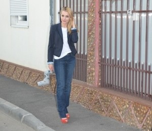 Astfel, aceasta a realizat o sedinat foto in care arata cum poti sa obtii o tinuta smart-casual. Frumoasa blonda a optat pentru o pereche de blugi albastri, o piesa vestimentara clasica, care da o nota relaxata outfit-ului. A optat pentru un top alb cu acelasi scop, iar accentul office este dat de un sacou negru caruia i-a suflecat manecile si o pereche de pantofi de culoare rosie, pentru o pata de culoare.