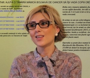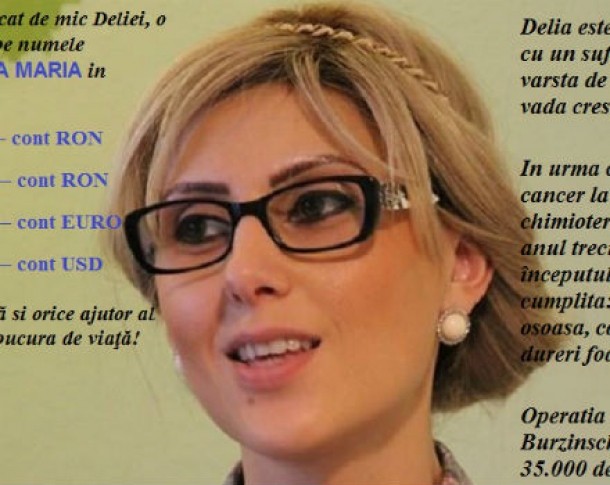 In urma cu un an a fost diagnosticata cu cancer la san. A urmat un tratament de chimioterapie ce s-a incheiat in septembrie anul trecut, iar in urma cu câteva zile, la inceputul lui februarie 2015, a primit vestea cumplita: boala a recidivat. Are metastaza osoasa, cancerul este foarte agresiv având si dureri foarte mari. Operatia se poate face numai la Clinica Burzinscki din Houston, SUA, dar costa 35.000 de dolari la inceput, apoi cate 2.000 de dolari lunar pentru tratament si recuperare. Cei care vor sa-i acorde un ajutor cat de mic Deliei, o pot face donand o suma de bani pe numele