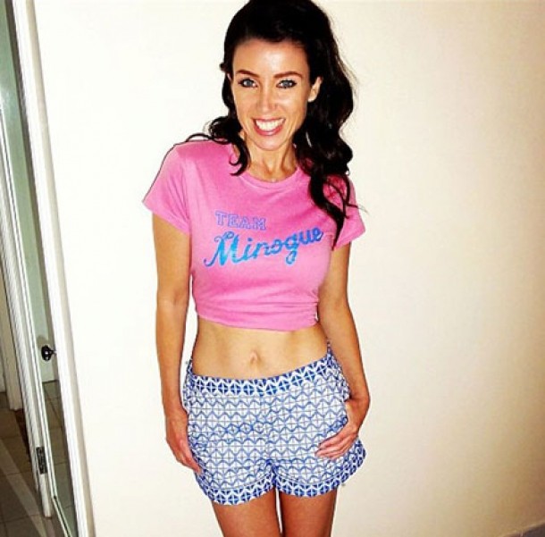 Imbracata intr-o pereche de pantaloni scurti si un tricou innodat in talie care ii lasa la vedere abdomenul perfect plat, Dannii arata ca o pustoaica de 20 de ani si nicidecum ca o femeie trecuta de 40.