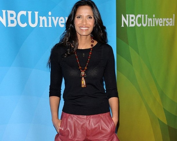 Padma Lakshmi a purtat pentru eveniment o pereche de pantaloni scurti din piele purtati in combinatie cu dres negru, un top de aceeasi culoare si o pereche de biker-boots.