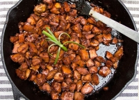 3. Se bagă tava la cuptor pentru 25 minute, până când pielița devine crocantă și aromată, dar carnea din interior rămâne moale, iar între timp, se pune untul ținut la temperatura camerei într-un blender cu puțină sare, alături de miere, sosul de soia și cel de curry.