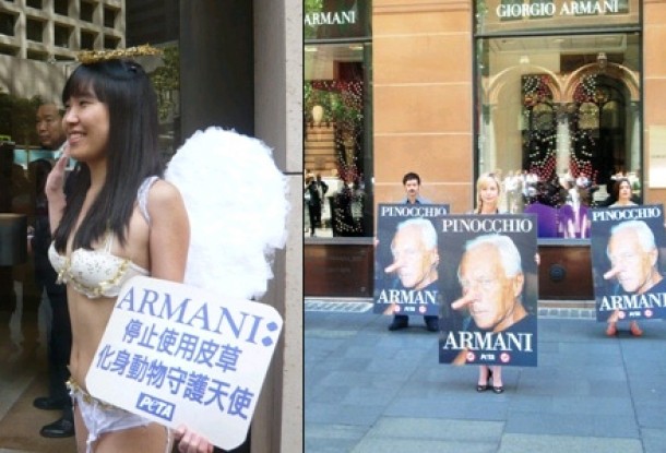 Din Hong Kong "zburam" in Australia, Sydney, unde activistii PETA scandau in fata magazinului Armani, cu plancarde unde era infatisat designerul cu un nas de Pinocchio, pentru ca nu si-a tinut promisiunea de a inlatura blana naturala din colectiile sale in mod permanent.