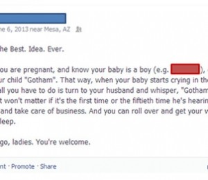 Doamnelor - daca sunteti gravide si stiti deja ca bebelusul vostru va fi baiat... luati in considerare sa il botezati 'Gotham' (n.r. numele orasului protejat de Batman). In acest fel, atunci cand copilul vostru incepe sa planga in miez de noapte, tot ce trebuie sa faceti este sa va intoarceti catre sotii vostri si sa le soptiti 'Gotham are nevoie de tine'. (in original: 'Gotham needs you.') Si nu va mai conta daca este prima data sau a 50-a oara cand sotul tau aude asta, cert este ca se va ridica din pat si se va ocupa de scutecul bebelusului. Si voi va puteti intoarce pe partea cealalta in pat si sa va bucurati de un somn binemeritat.