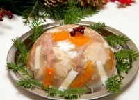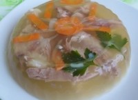 1 ardei roşu gras, 1 conservă porumb (sau mazăre), 1 legătură mărar (sau pătrunjel), 2 ceşti supă de pui (curcan sau vită), 10 ouă, 20 g gelatină, 300 g şuncă (sau carne fiartă de pui, curcan, vită sau porc), sare, piper după gust