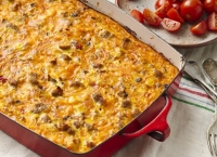 1/2 ardei gras, 1/2 linguriță sos Tabasco, 1/2 linguriță praf de chili, 1 franzelă, 1 legătură ceapă verde, 1 roșie medie, 170 g carne tocată de vită, 300 g cheddar ras, 500 g cremă de brânză, chipsuri tacos