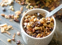 400 g fulgi de ovăz, 120 g migdale feliate, 100 g nuci pecan pisate, 230 g semințe de floarea soarelui, 75 g ulei de susan, 120 ml sirop de arțar, 2 lingurițe esență de vanilie, 2 lingurițe scorțișoară, 1 linguriță cuișoare, 1/2 linguriță esență portocală, 1 linguriță sare de mare