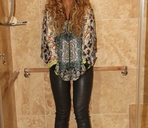 Astfel, Beyonce apare in imagine la dus, imbracata intr-o pereche de pantaloni din piele, o camasa si nu a renuntat nici la incaltaminte si a optat pentru o pereche de tenisi de culoare diferita, unul albastru neon si altul galben.