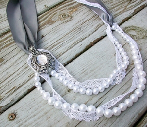 Colierul vintage din perle este potrivit pentru orice mireasă. Acesta poate fi realizat foarte simplu, dintr-un şirag de perle, o broşă veche moştenită de la bunica sau achiziţionată dintr-un târg şi o panglică din saten.