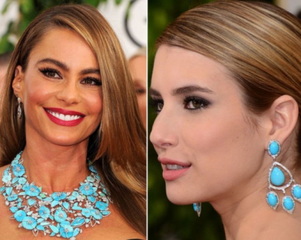 Sofia Vergara a ales pentru gala Golden Globes un colier statement in nuante de turcoaz, in timp ce Emma Roberts a purtat o pereche de cercei candelabru cu pietre mari.