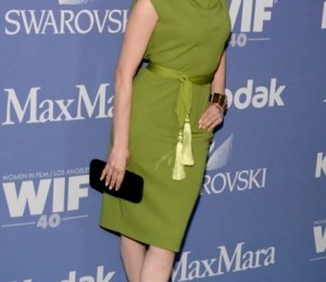 Buzele intr-o nuanta de ruj indrazneata au contrastat cu rochia verde pe care actrita a ales sa o poarte, iar pantofii negri cu toc nu au facut decat sa ii sublinieze picioarele subtiri.