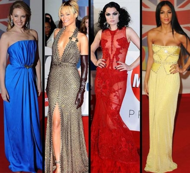 Cand Rihanna a pasit pe covorul rosu toate camerele au fost atintite asupra ei. Aparitia ei a fost cu adevarat spectaculoasa. Cantareata in varsta de 24 de ani a purtat o rochie aurie, creatie Givenchy din colectia primavara 2012. Brodata cu cristale, rochia indrazneata avea un decolteu generos si o crapatura la spate si in fata, punand in evidenta latura provocatoare a artistei. Rihanna a accesorizat rochia cu o pereche de pantofi, de asemenea, Givenchy si manusi maro din piele.