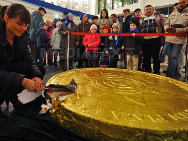 Moneda, invelita in staniol auriu, va sta expusa in Sun Plaza, in zona Blue Atrium, timp de doua saptamani, dupa care va fi impartita copiilor din centrele de plasament din Sectorul 4, dupa cum a declarat primarul.