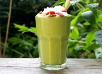 2. Se adaugă într-un pahar de sticlă gheața și laptele de soia, iar peste acestea se varsă amestecul anterior, fără a se mai amesteca.