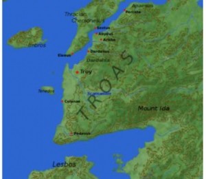 Cetatea Troia se afla pe o colina, dincolo de campia Scamadrului, unde au avut loc bataliile Razboiului Troian. Orasul antic se afla in prezent la circa 15 km de coasta, dar acum 3000 de ani, gura de varsare a raului Scamandru se afla cu 5 km mai in interior, intr-un mic golf care a fost umplut cu aluviuni.