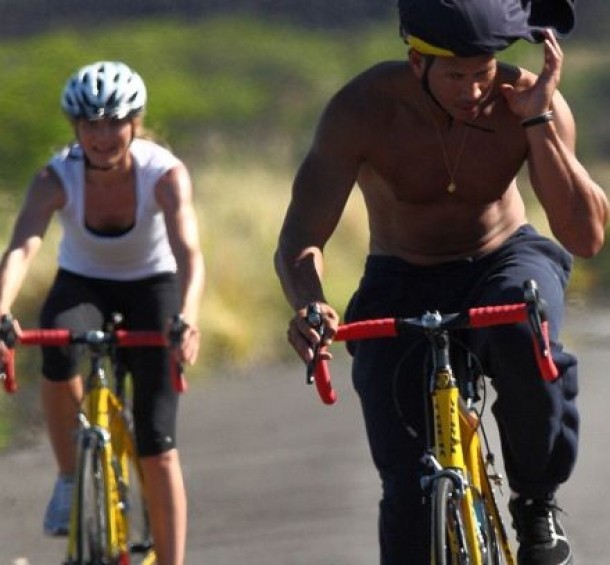 Cei doi indragostiti au fost surprinsi echipati complet de ciclism si parcurgand kilometri intregi cu bicicleta.